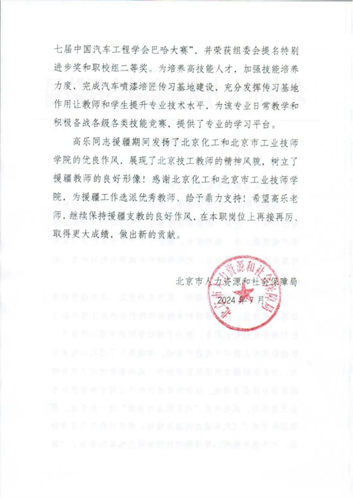 日前,北京市人力资源和社会保障局发来感谢信。对北京市工业技师学院教师高乐圆满完成援疆工作表示诚挚的慰问和衷心的感谢!