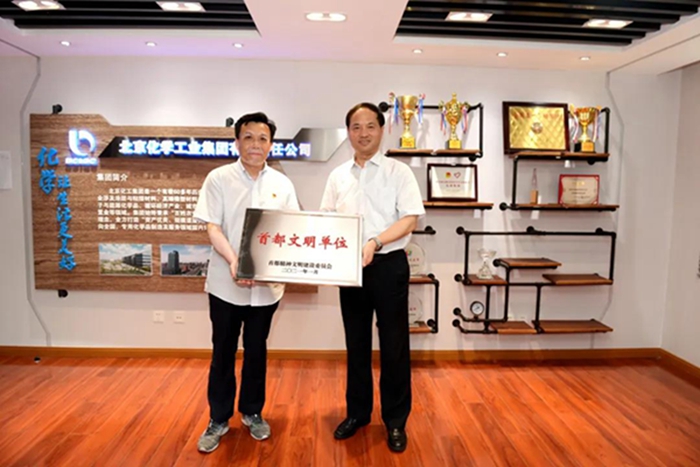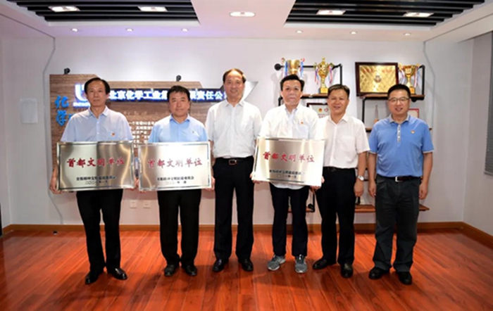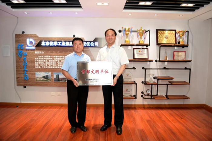 9月1日,北京化工集团党委书记、董事长王国华向获首都文明单位称号的3个单位授牌,党委副书记吴瑞峰,总经理助理、华腾拓展公司党总支书记李泳,化研院党总支书记杨传忠,华腾天海公司党总支书记崔志宏参加授牌仪式。
